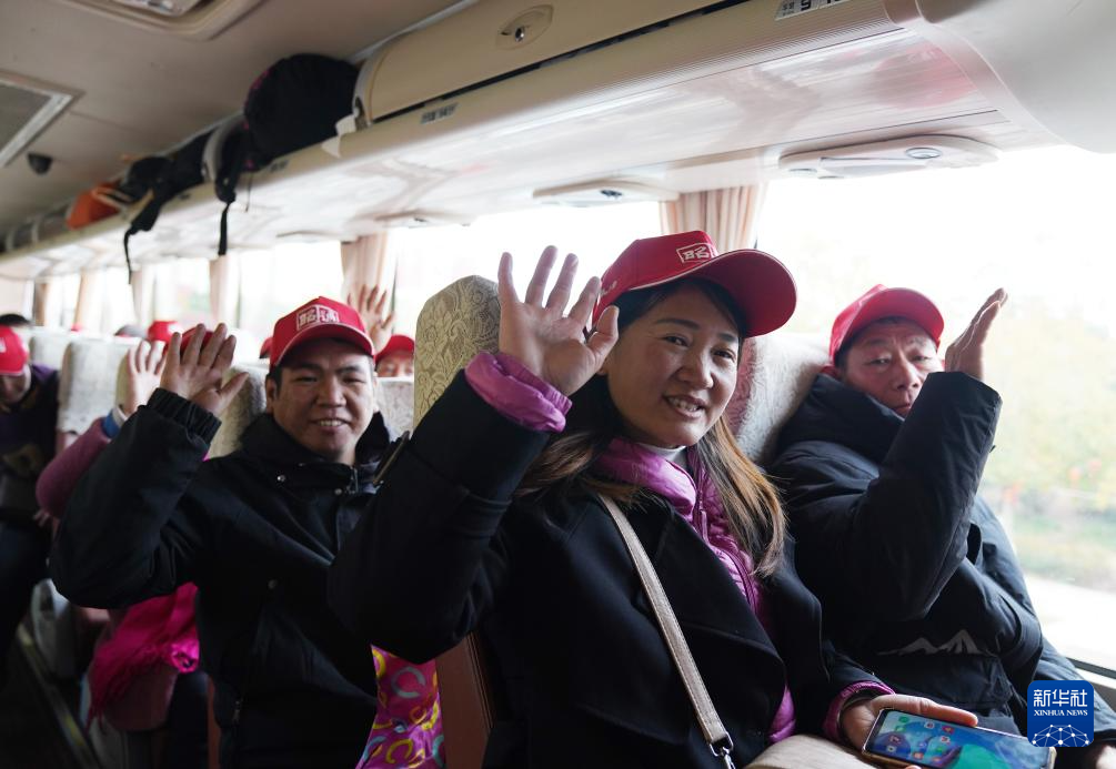 2月8日,乘坐免费返岗直通大巴车的人员在出发前挥手致意。新华社发(梁志强摄)