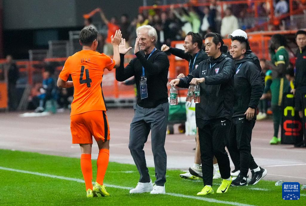3月1日,云南玉昆队球员李松益(左一)在进球后与主教练约恩·安德森(左二)击掌庆祝。新华社记者 陈欣波 摄