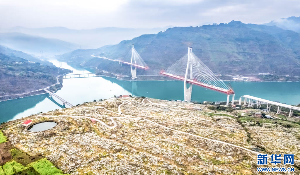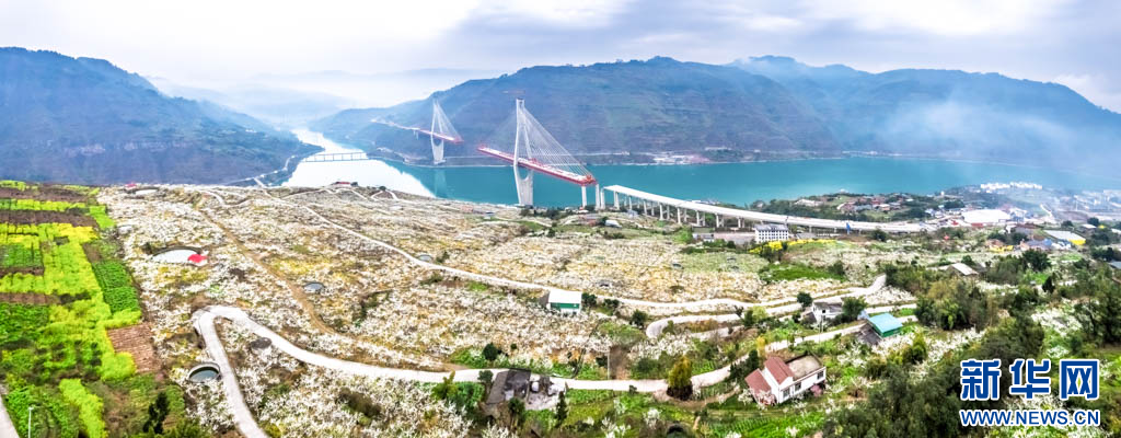 李花与远处的金沙江及在建的桥梁交织如画(3月12日摄)。新华网发(曾三东 摄)