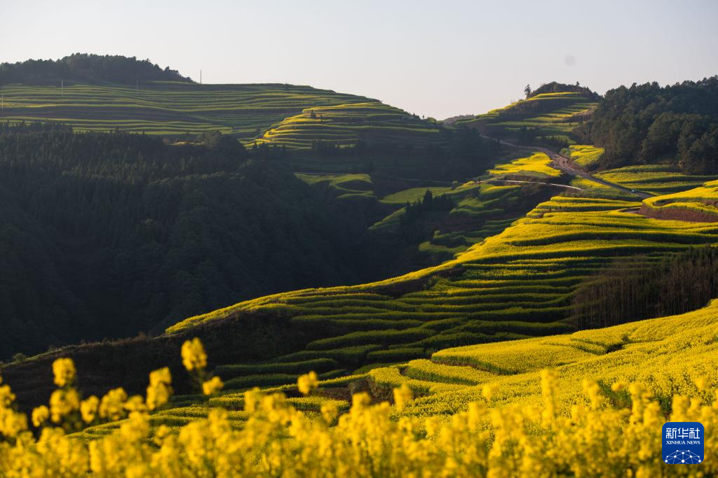 金浪翻涌间,错落分布的村寨若隐若现,与花海、山峦共同勾勒出一幅田园春景图,吸引国内外游客纷至沓来,感受春天的气息。