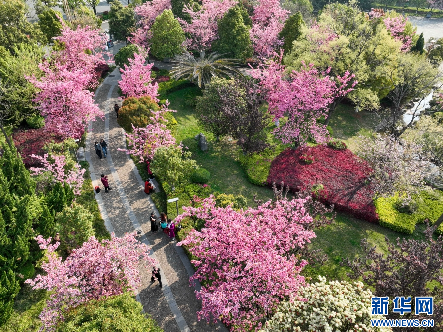 近日,云南省曲靖市沾益区玉林广场樱花竞相绽放,鸟儿在花间嬉戏,游人踏春赏花。航拍视角下,樱花点缀在城市、亭阁、道路间,勾勒出一幅美丽的春日画卷。