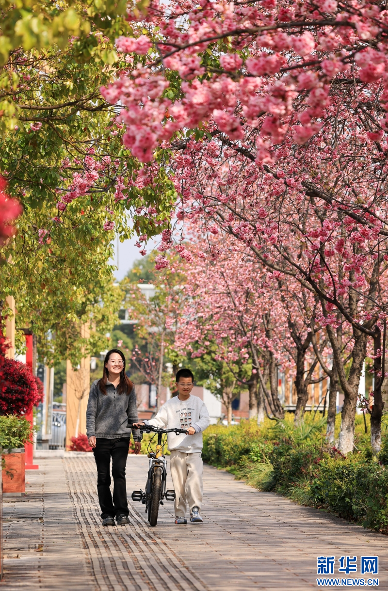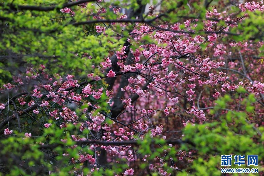 云南省曲靖市沾益区玉林广场,樱花竞相绽放(3月14日摄)。新华网发(孙文来 摄)
