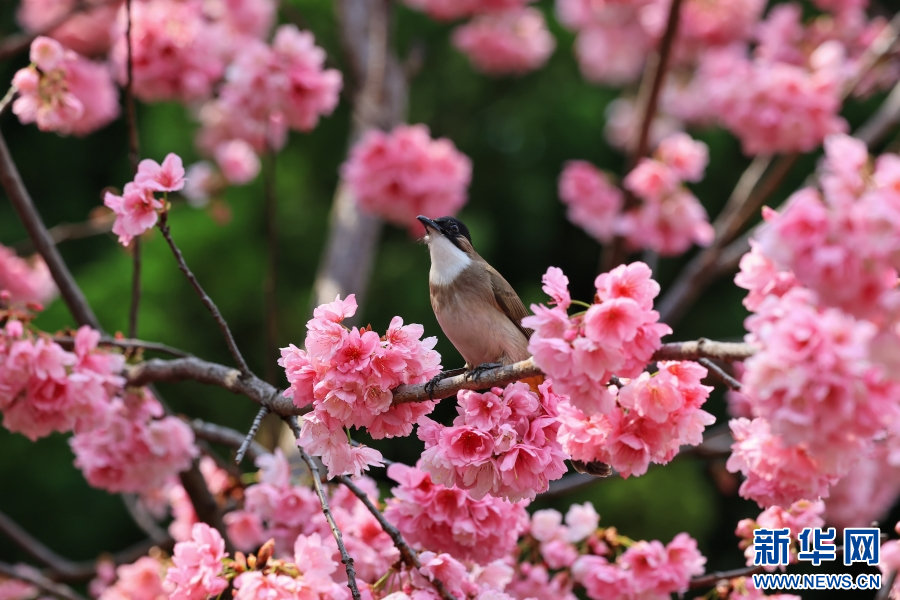 云南省曲靖市沾益区玉林广场,鸟儿立于樱花枝头(3月14日摄)。新华网发(孙文来 摄)