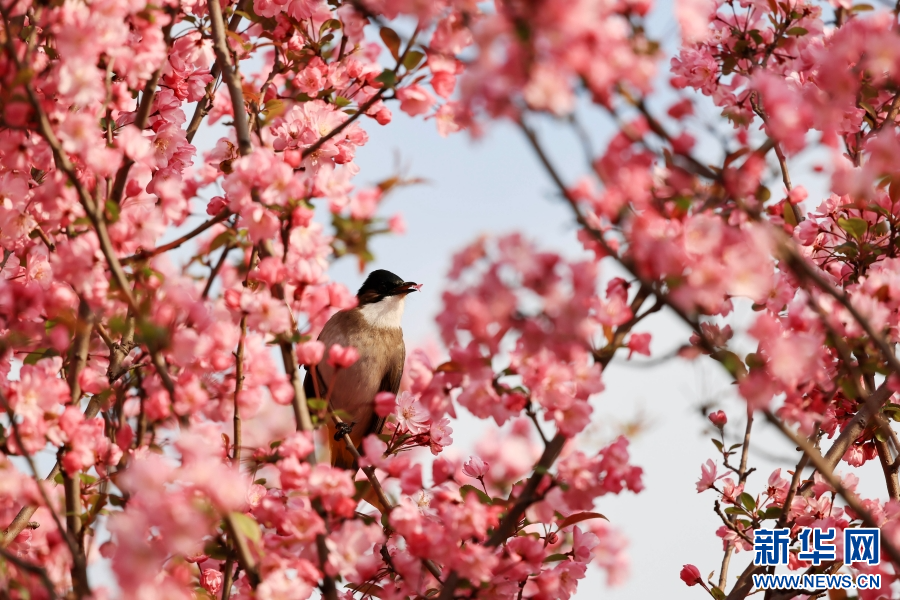 云南省曲靖市沾益区玉林广场,鸟儿嘴衔樱花花瓣(3月14日摄)。新华网发(孙文来 摄)