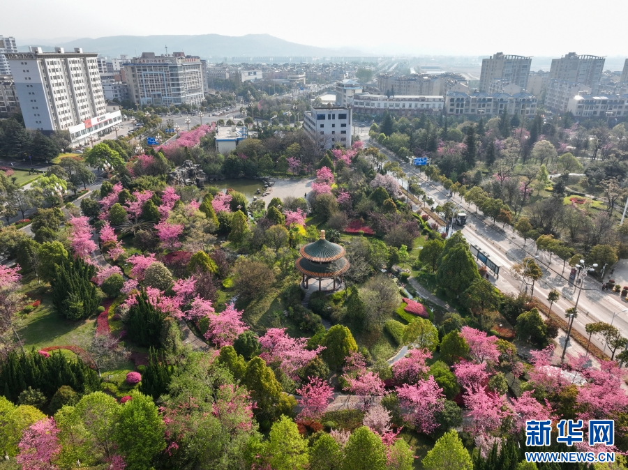 航拍云南省曲靖市沾益区玉林广场樱花绽放(3月14日摄)。新华网发(孙文来 摄)