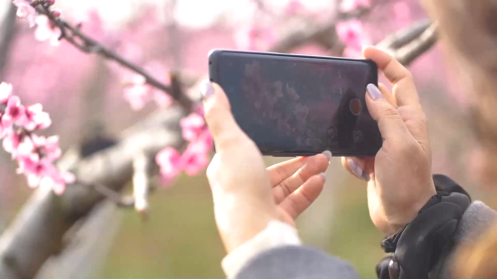 昆明游客哏流娅说:“我们几乎每年都来,原来的小路是走村串寨,现在很好,有了一条直通大道,今年才修通的。这一片桃园紧邻着茈碧湖,看出去的话那就是水天一色,让人心情特别愉悦。”