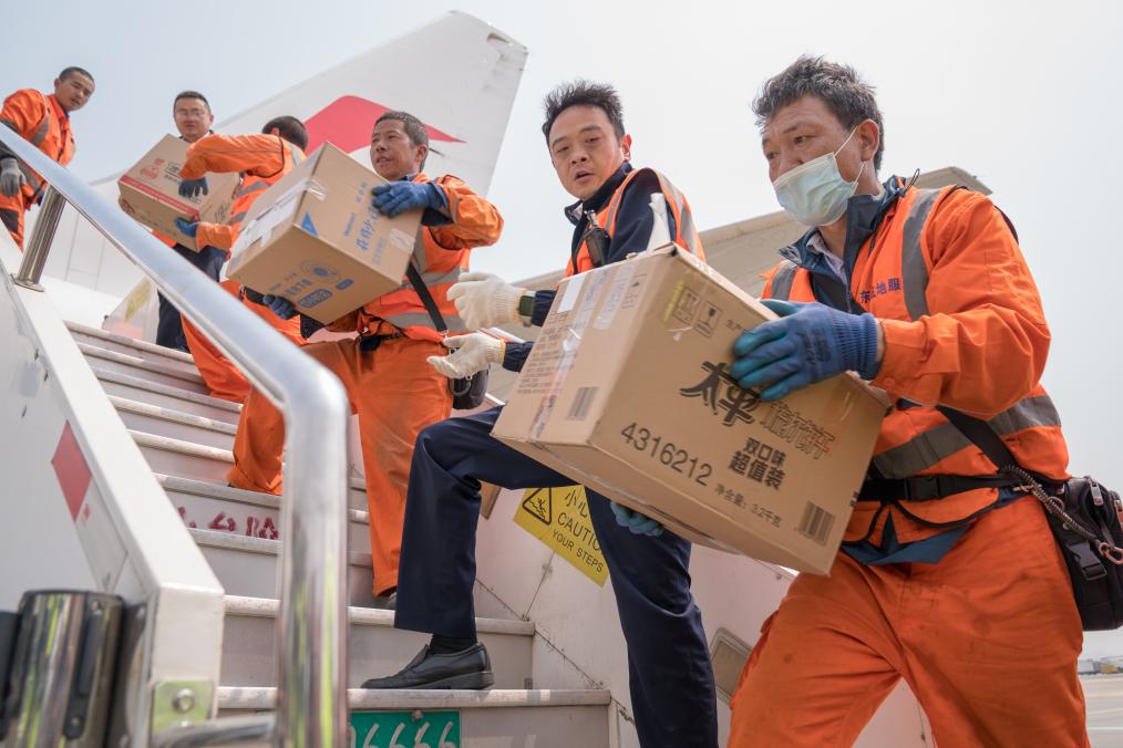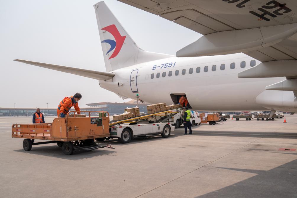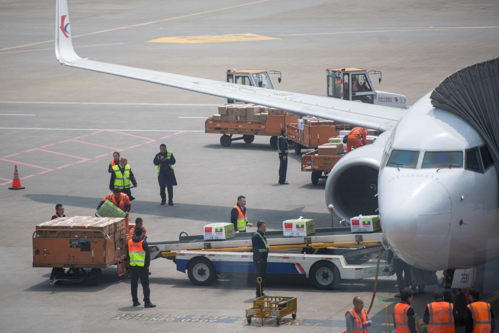 3月30日,在昆明长水国际机场,工作人员往飞机上运送救援物资。新华社发(彭奕凯 摄)