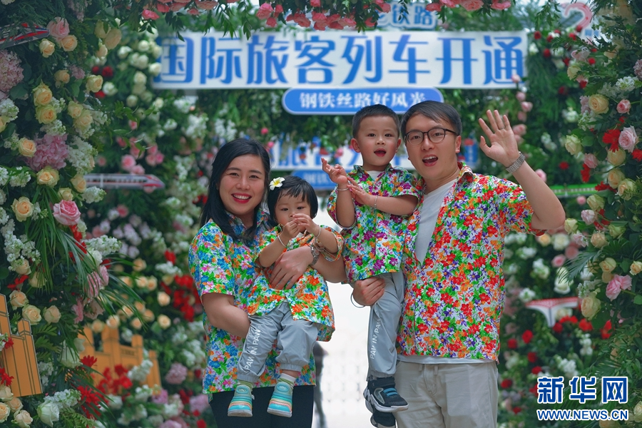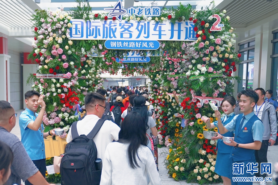 4月12日,中老铁路磨憨站,旅客留影。新华网发(周涛 摄)