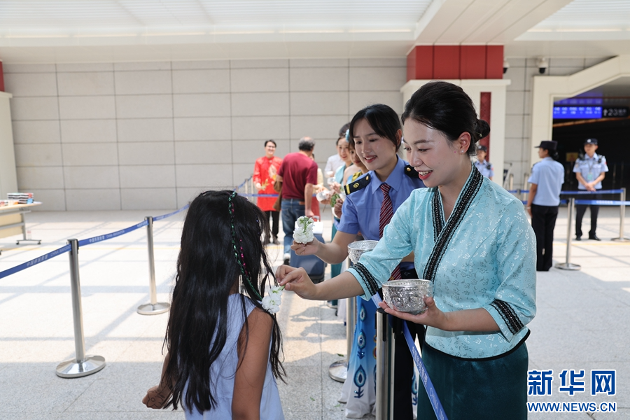 4月12日,中老铁路国际旅客列车开行两周年“巧遇”泼水节。“国门车站”磨憨站国际旅客通道装点成了花团锦簇的“幸福长廊”,列车工作人员身穿民族服饰,手持银色水瓢,用树枝和鲜花蘸取清水,为旅客们送上泼水祝福。