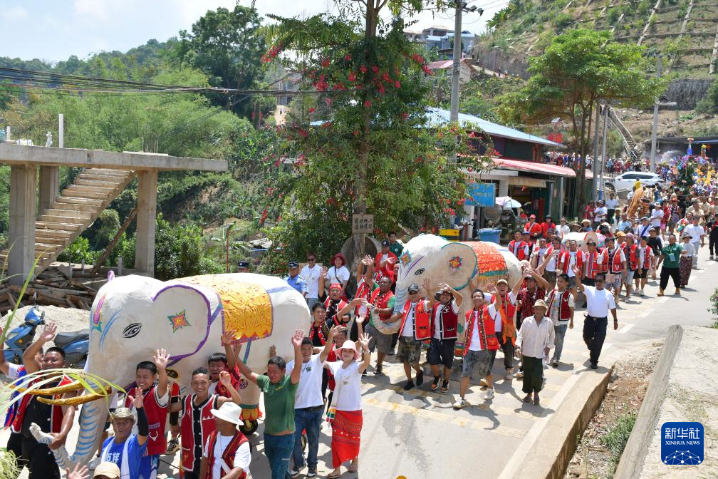 4月18日,云南省临沧市沧源佤族自治县班老乡群众抬着大象塑像巡游村寨。新华社发(李江龙 摄)