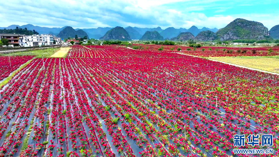 航拍千亩玫瑰花田(4月20日摄)。新华网发(丘北县融媒体中心 供图)
