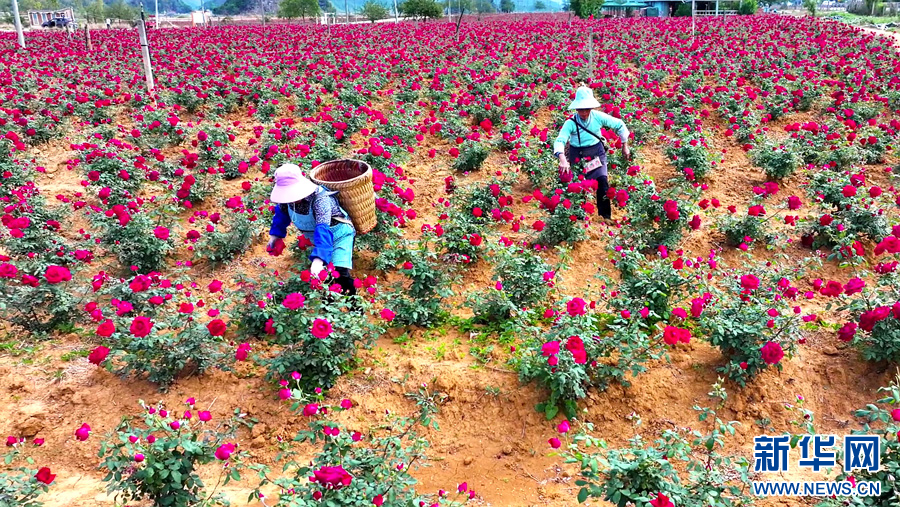 花农采摘玫瑰花(4月20日摄)。新华网发(丘北县融媒体中心 供图)