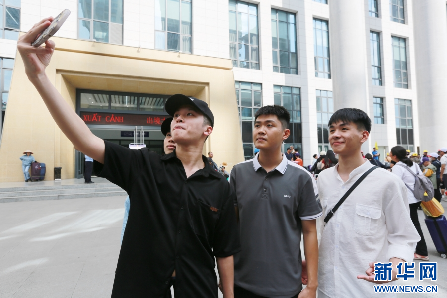 越南游客在中国河口公路口岸南溪河联检大楼前合影留念(5月2日摄)。新华网发(薛莹莹 摄)