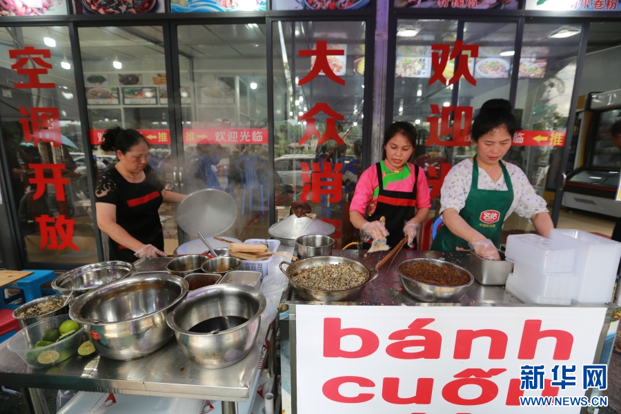 在云南省红河州河口县,越南商贩正在制作越南小卷粉(5月2日摄)。新华网发(薛莹莹 摄)
