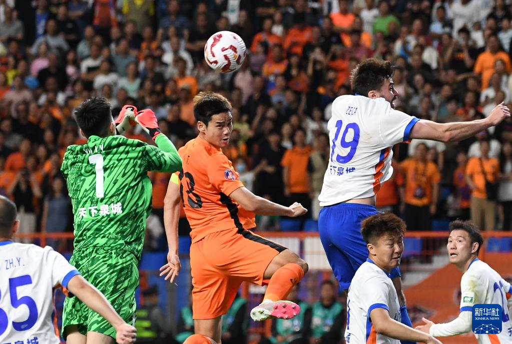 5月5日,山东泰山队守门员于金永(右)在比赛中扑救。新华社发(彭奕凯 摄)