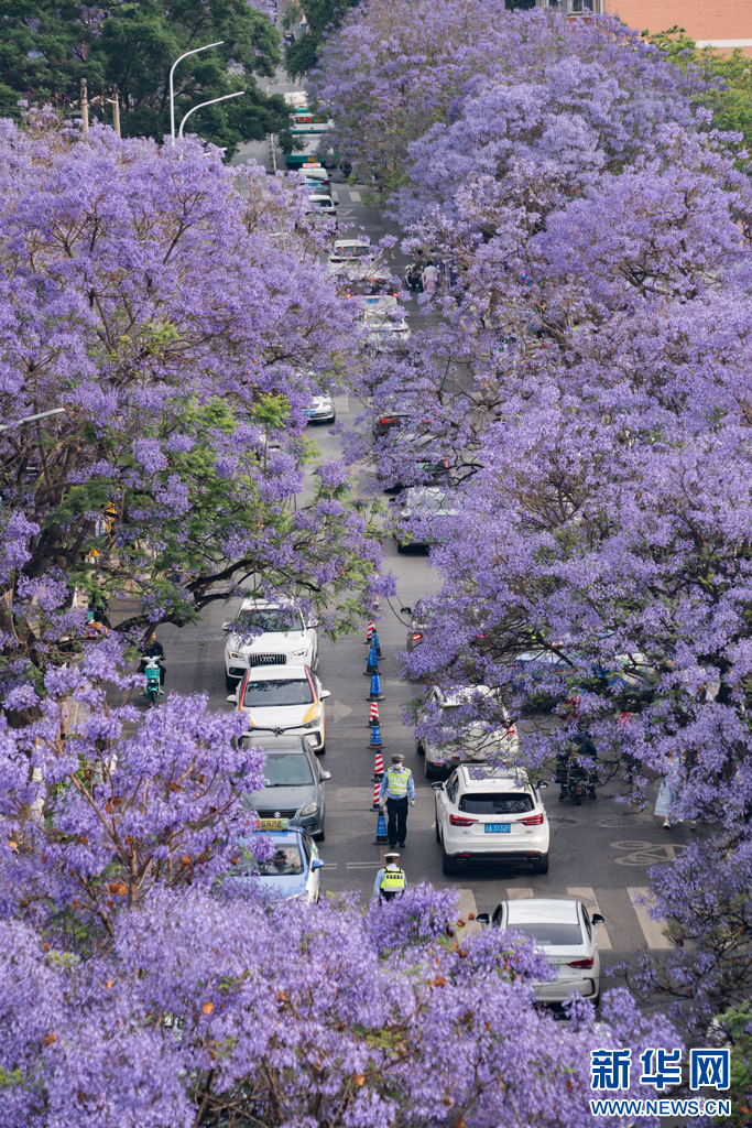 蓝花楹树下的车流及指挥交通的交警(5月1日摄)。新华网发(郑益 摄)