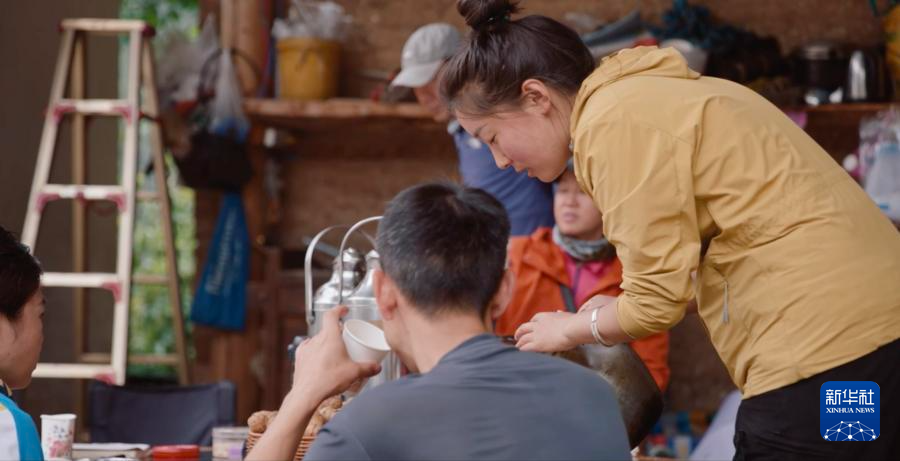 边玛永宗正在接待前来徒步的游客。新华社发