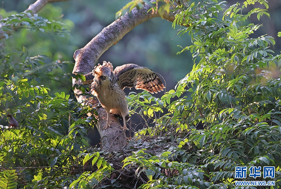 凤头鹰雕“鸟妈”把食物撕碎喂给雏鸟(5月19日摄)。新华网发(杨学飞 摄)