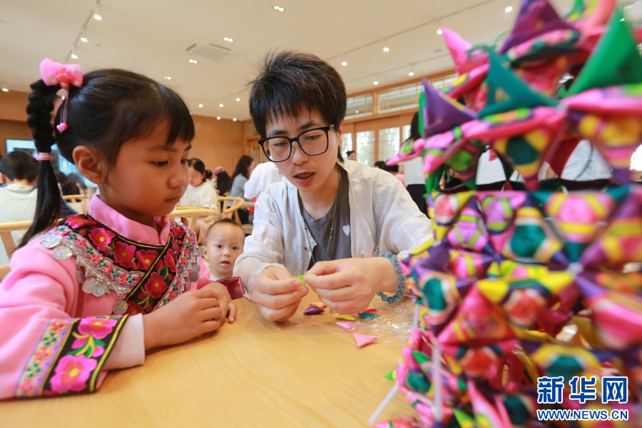 恰逢“六一”遇上端午节假期,云南省蒙自市红河书院开展“菱角织夏 艾草寄情”端午民俗亲子手作课(5月31日摄)。新华网发(薛莹莹 摄)