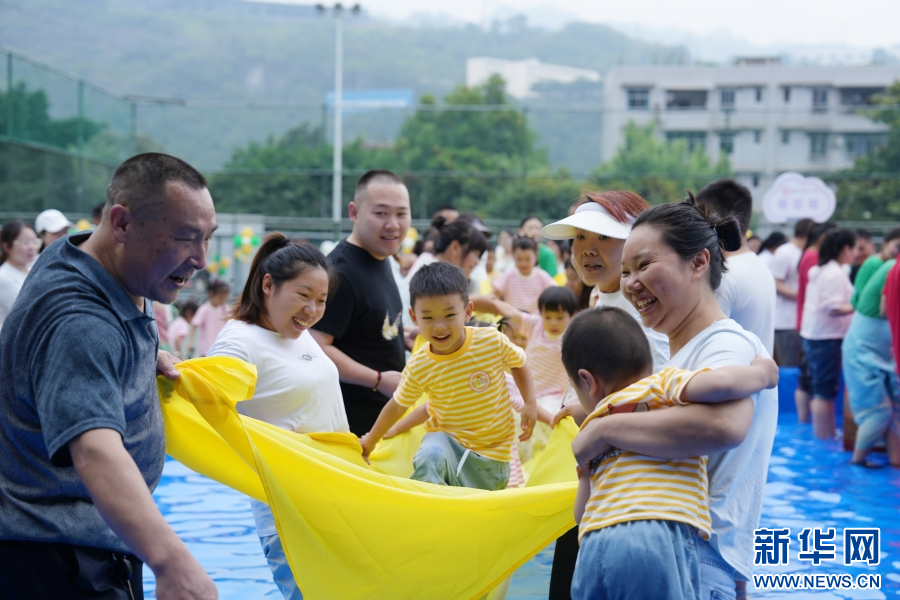 云南省水富市一幼儿园,家长、老师陪孩子们玩游戏迎“六一”(5月29日摄)。新华网发(狄廷秀 摄)