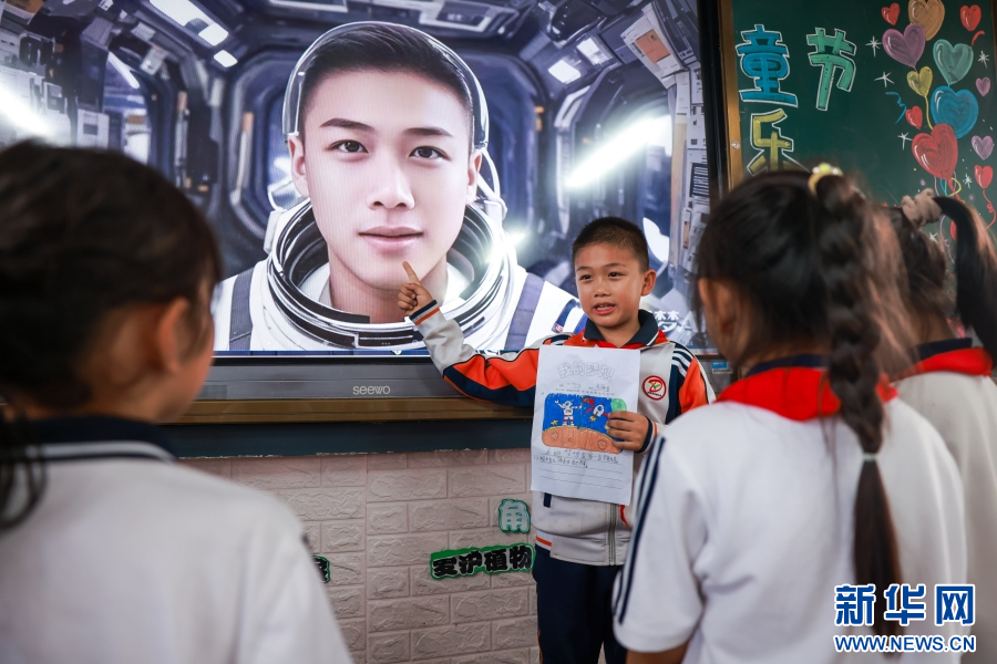 在云南省开远市东城小学“六一玩转科技 童心趣闯未来”主题活动中,二年级学生通过AI图片技术,展示自己当上宇航员的样子(5月30日摄)。新华网发(陶家淇 摄)