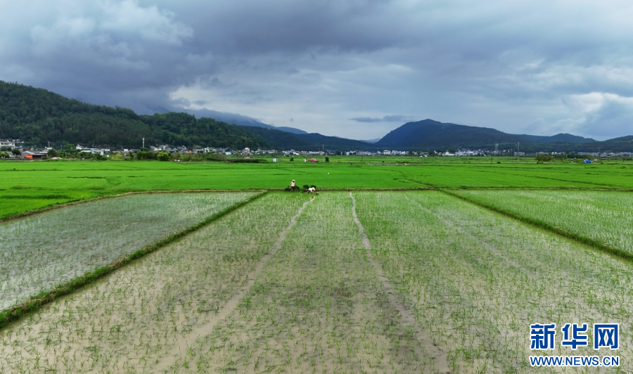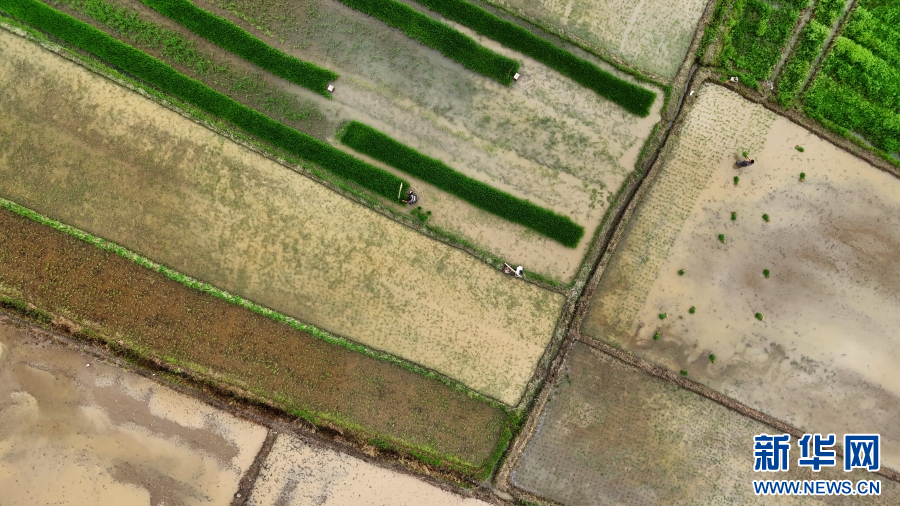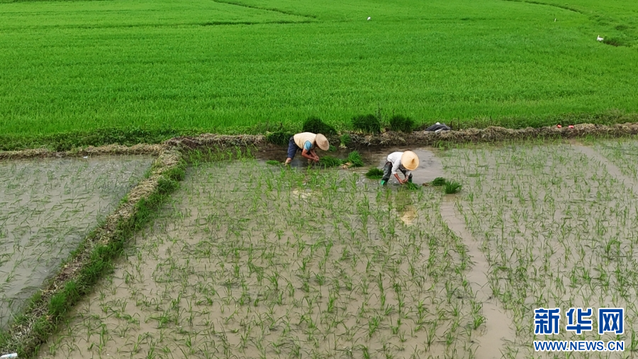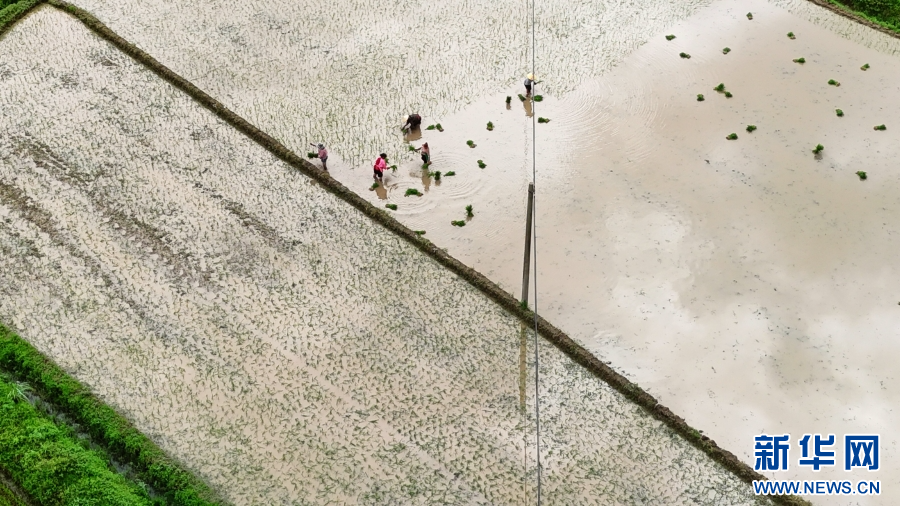 6月4日,在云南省腾冲市西源街道马常村,农民正在栽种水稻苗(无人机照片)。新华网发(赵辉 摄)