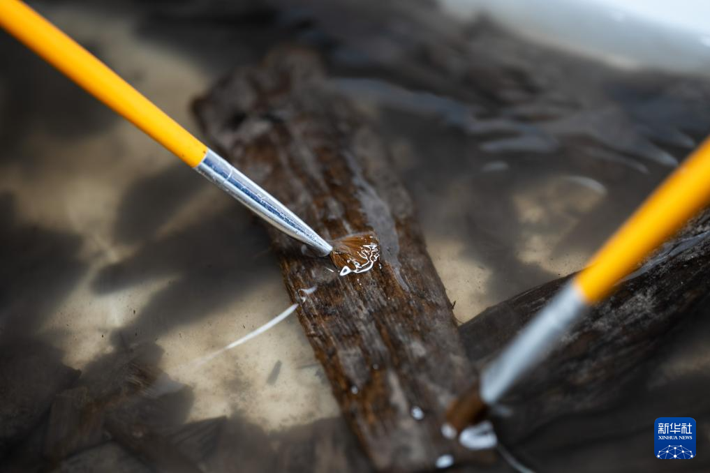 云南省文物考古研究所工作人员在清理木简(2025年4月24日摄)。新华社记者 胡超 摄