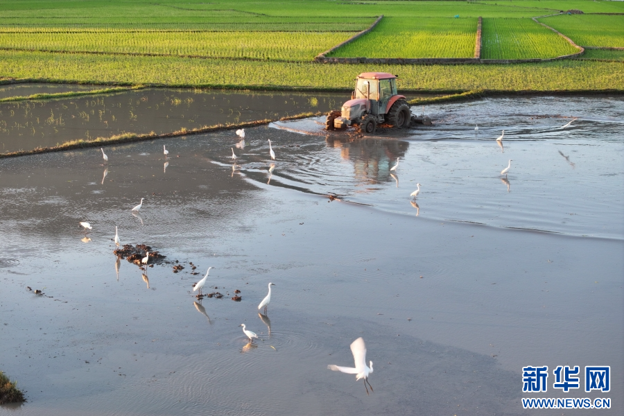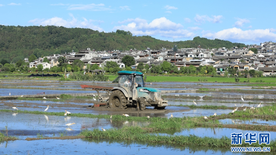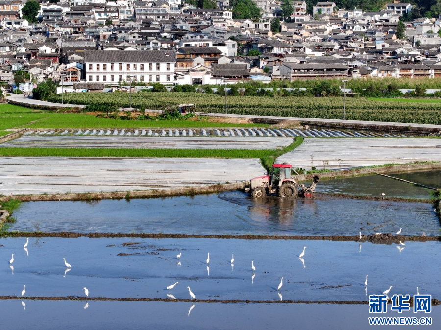 云南省腾冲市和顺镇,农机忙碌,白鹭翩跹(6月15日摄)。新华网发(龚祖金 摄)
