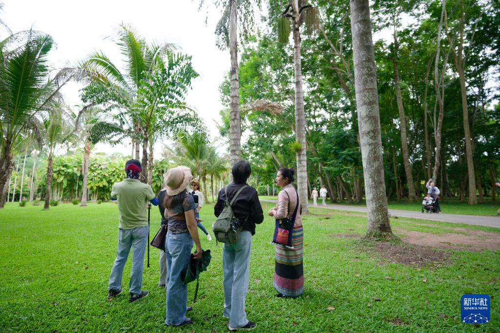 6月15日,讲解员(右一)在中国科学院西双版纳热带植物园向游客讲解热带雨林中常见的鸟类和植物。新华社记者 高咏薇 摄