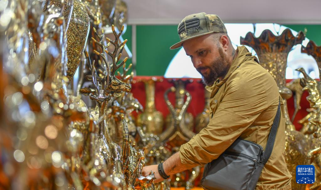 6月18日,来自巴基斯坦的参展商在展区内摆放工艺品。新华社发(彭奕凯摄)