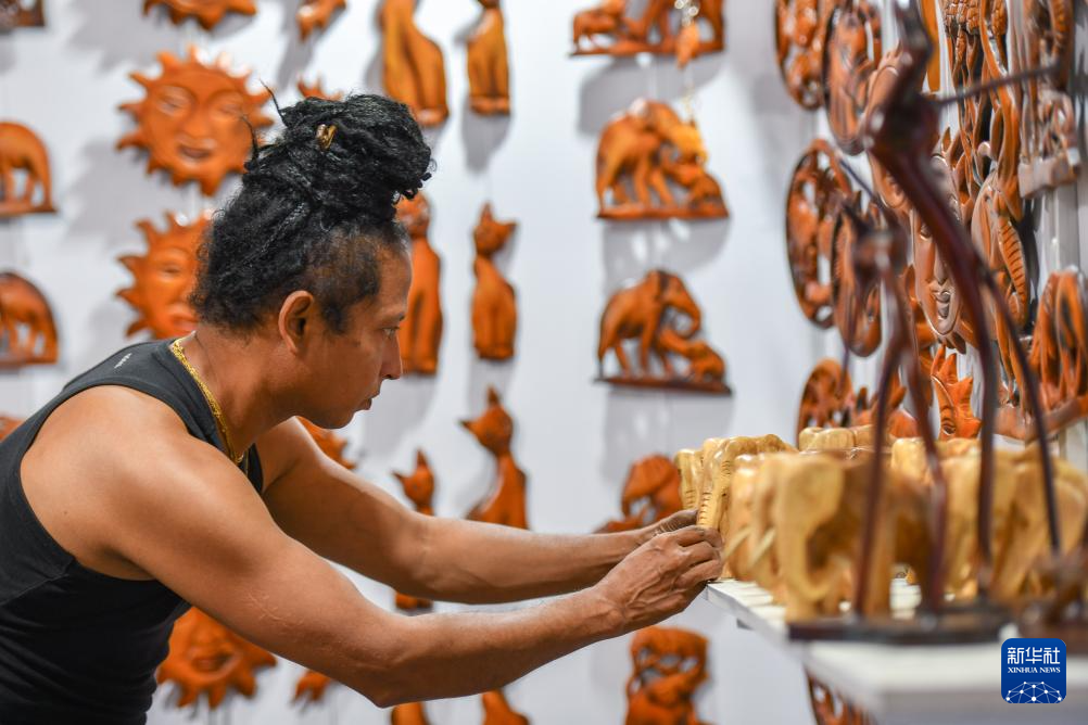 6月18日,来自斯里兰卡的参展商在展区内摆放木雕工艺品。新华社发(彭奕凯摄)