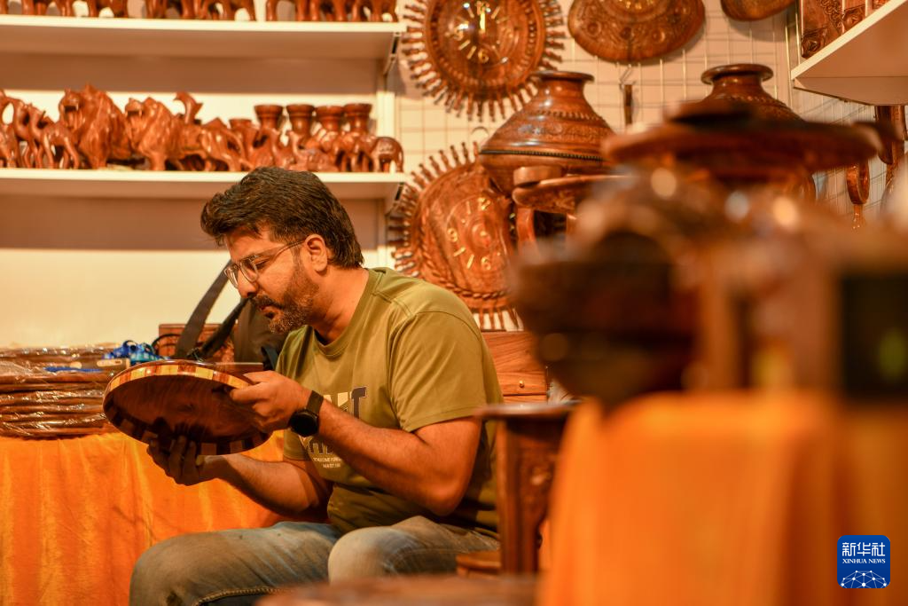 6月18日,来自巴基斯坦的参展商修饰即将展出的木雕工艺品。新华社发(彭奕凯摄)