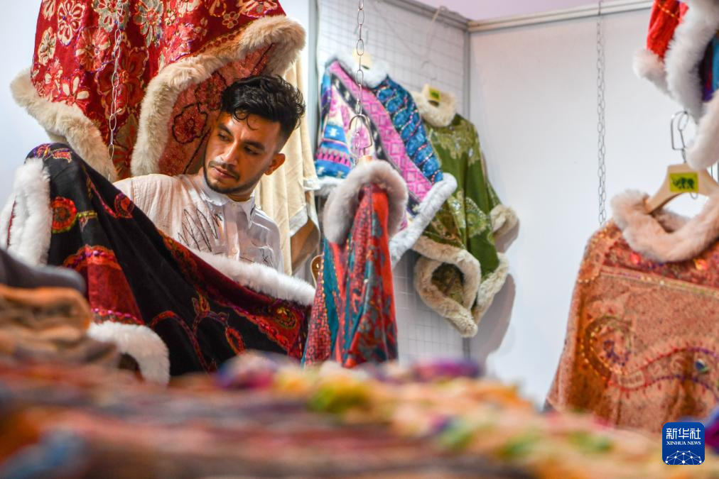 6月18日,来自尼泊尔的参展商整理即将展出的特色服饰。新华社发(彭奕凯摄)