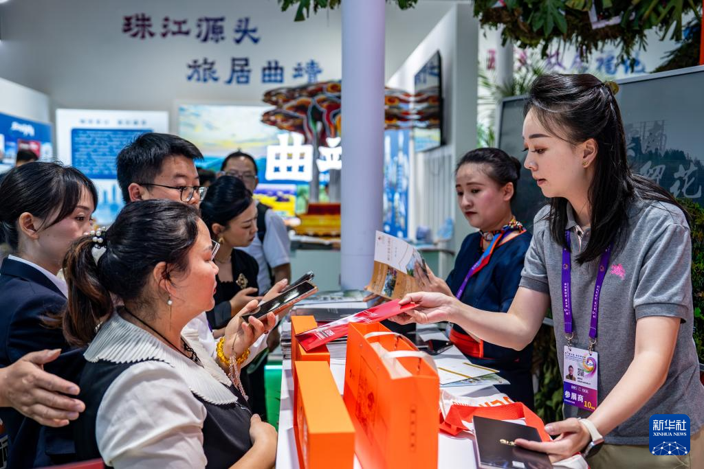 6月20日,参展商在第9届中国—南亚博览会旅居云南馆推介文旅产品。新华社记者 胡超 摄