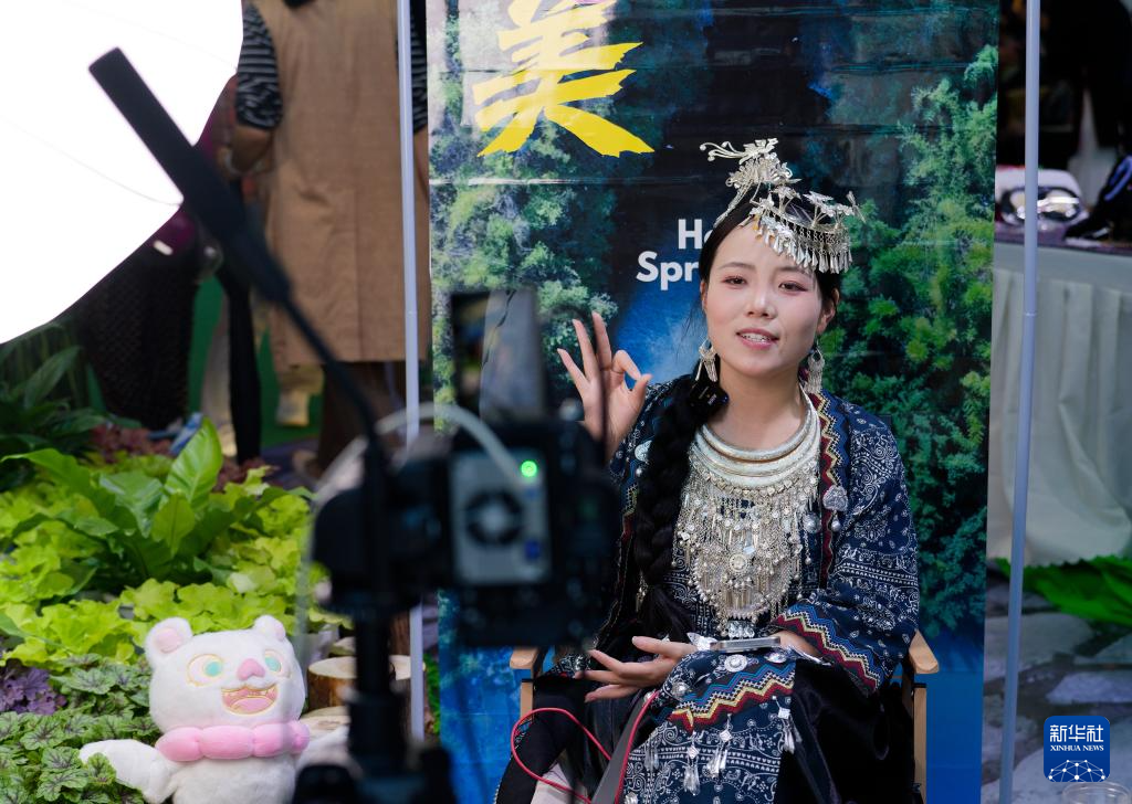 6月20日,一名参展商在第9届中国—南亚博览会旅居云南馆直播介绍文山坝美特色旅游产品。新华社记者 高咏薇 摄