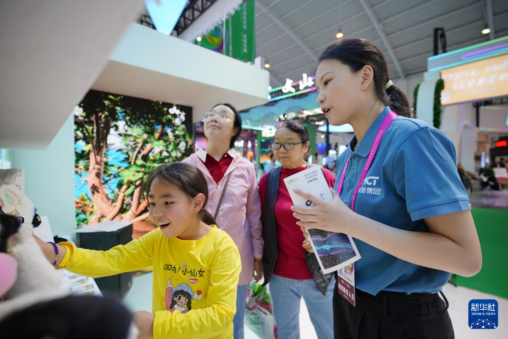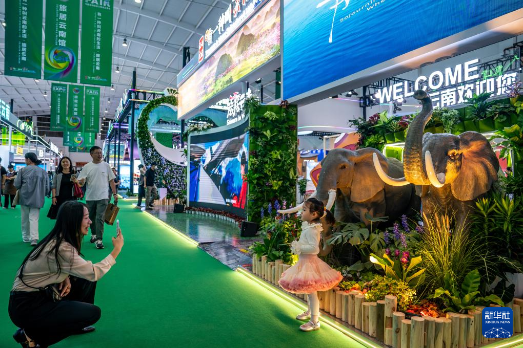 6月20日,观众在第9届中国—南亚博览会旅居云南馆给孩子拍照留念。新华社记者 胡超 摄