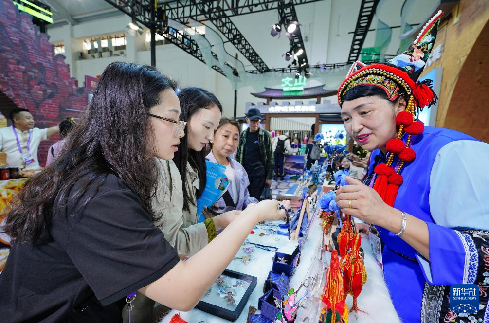 6月20日,观众在第9届中国—南亚博览会旅居云南馆了解文山坝美的文创产品。新华社记者 高咏薇 摄