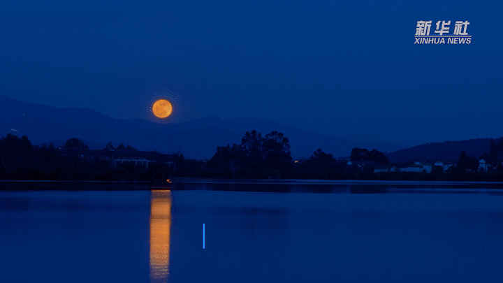 戌时(19:00-21:00),夜幕降临,圆月升起,月光洒在湖面,粼粼清辉里浮动着万千银鳞。