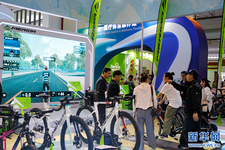 市民在云南体育展区体验自行车运动(6月20日摄)。新华网发