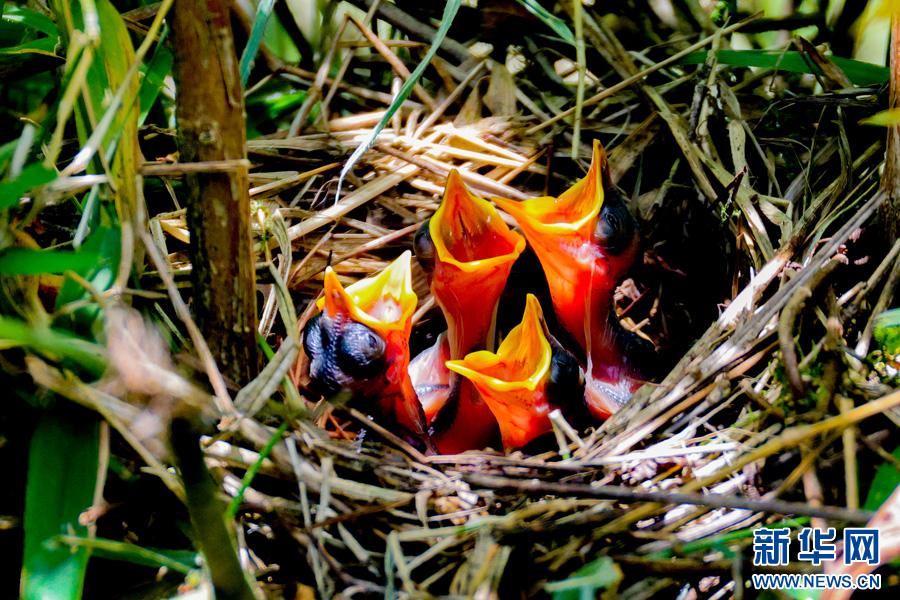 嗷嗷待哺的画眉雏鸟(6月21日摄)。新华网发(张天祥 摄)