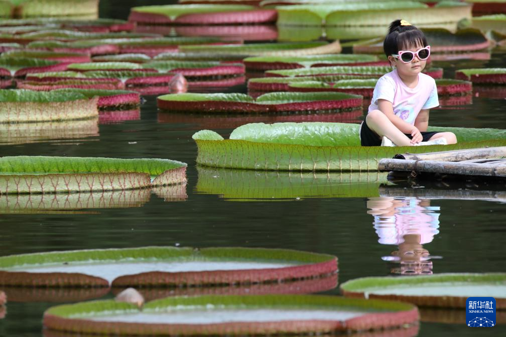 7月12日,小朋友在云南省勐腊县的中国科学院西双版纳热带植物园景区体验乘坐王莲。新华社发(李云生 摄)