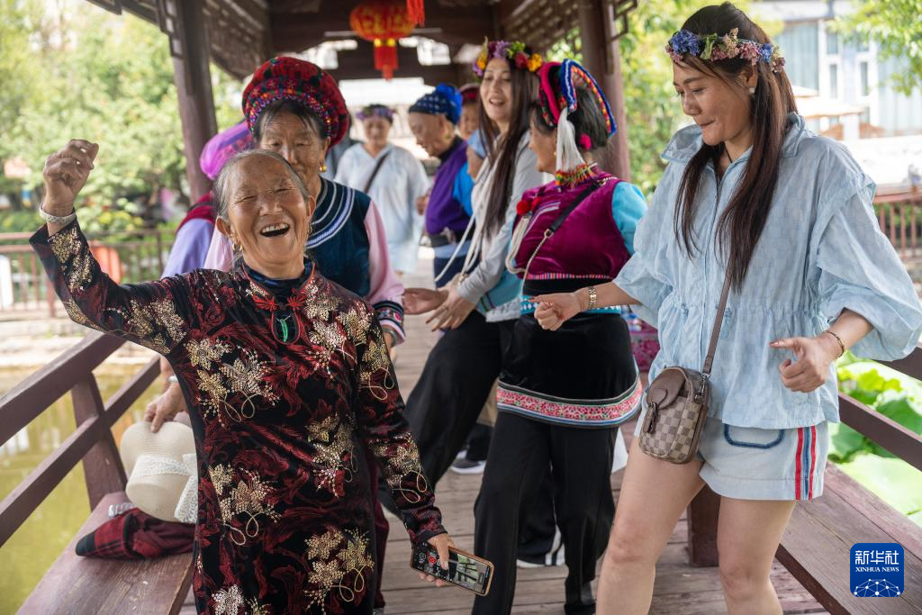 7月12日,游客在大理西湖和当地群众共舞。新华社发(罗新才 摄)
