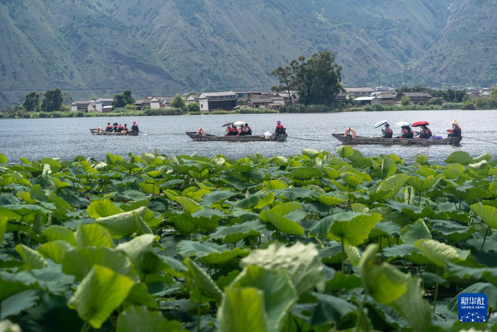7月12日,游客在大理西湖划船游览。新华社发(罗新才 摄)