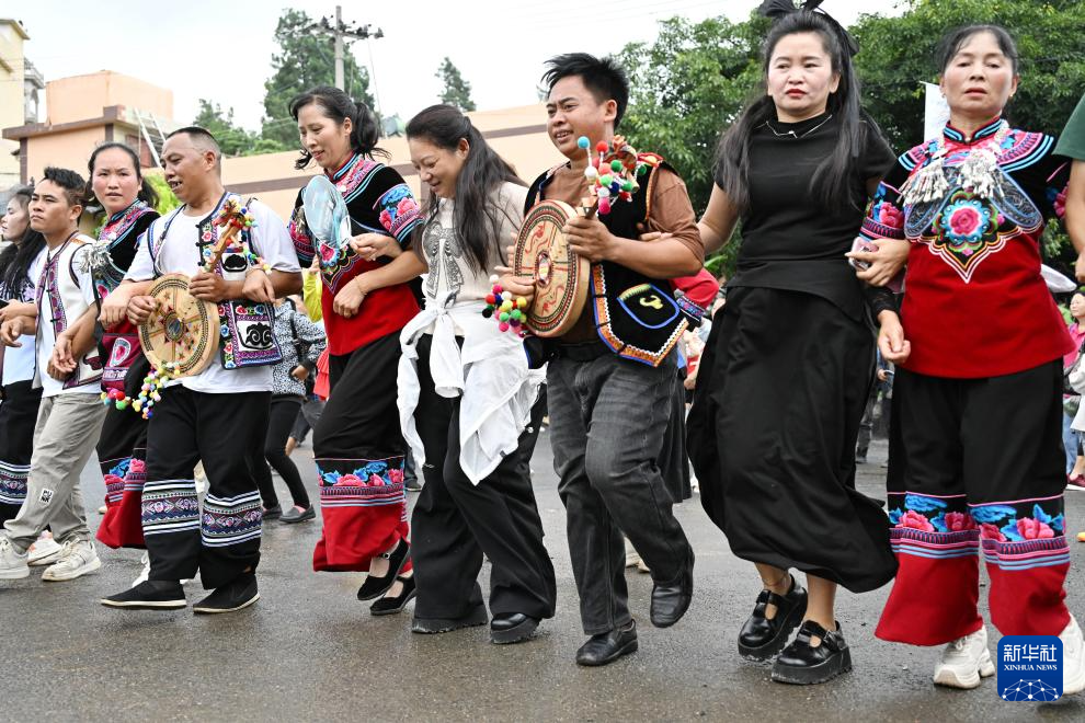 7月12日,游客在云南省文山壮族苗族自治州文山市新平社区庄子田村与当地村民一起体验弦子舞。新华社发(熊平祥 摄)