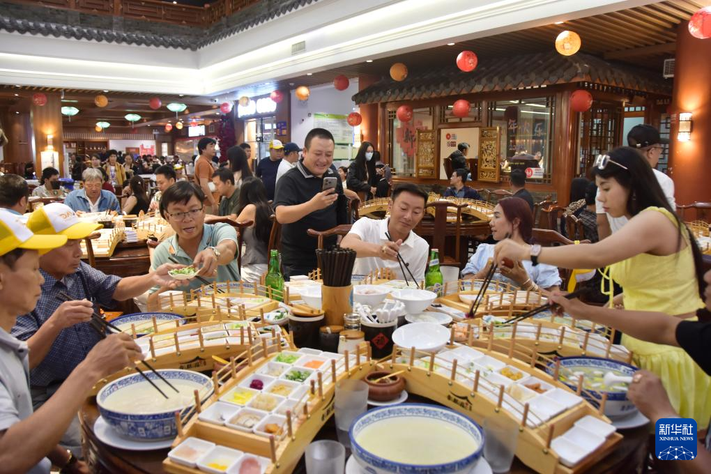7月12日,来自越南的游客在云南省蒙自市一过桥米线店享用过桥米线。新华社发(薛莹莹 摄)