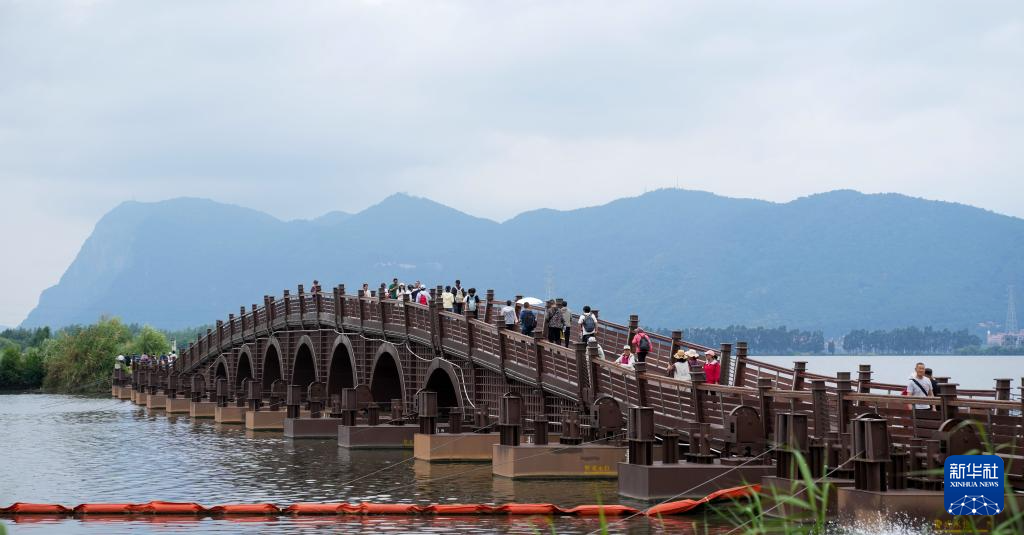 7月12日,游客在昆明市东风坝七孔浮桥游览参观。新华社发(郝亚鑫 摄)