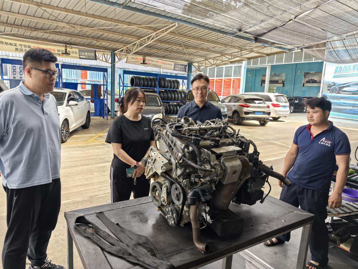 7月9日,中国人寿财险红河州中心支公司负责人陈娅丽(左二)第一时间带队到当地到某家修理厂了解车辆受损程度,指导修理厂抢修水淹车辆,为客户挽回车辆损失。(满明摄)