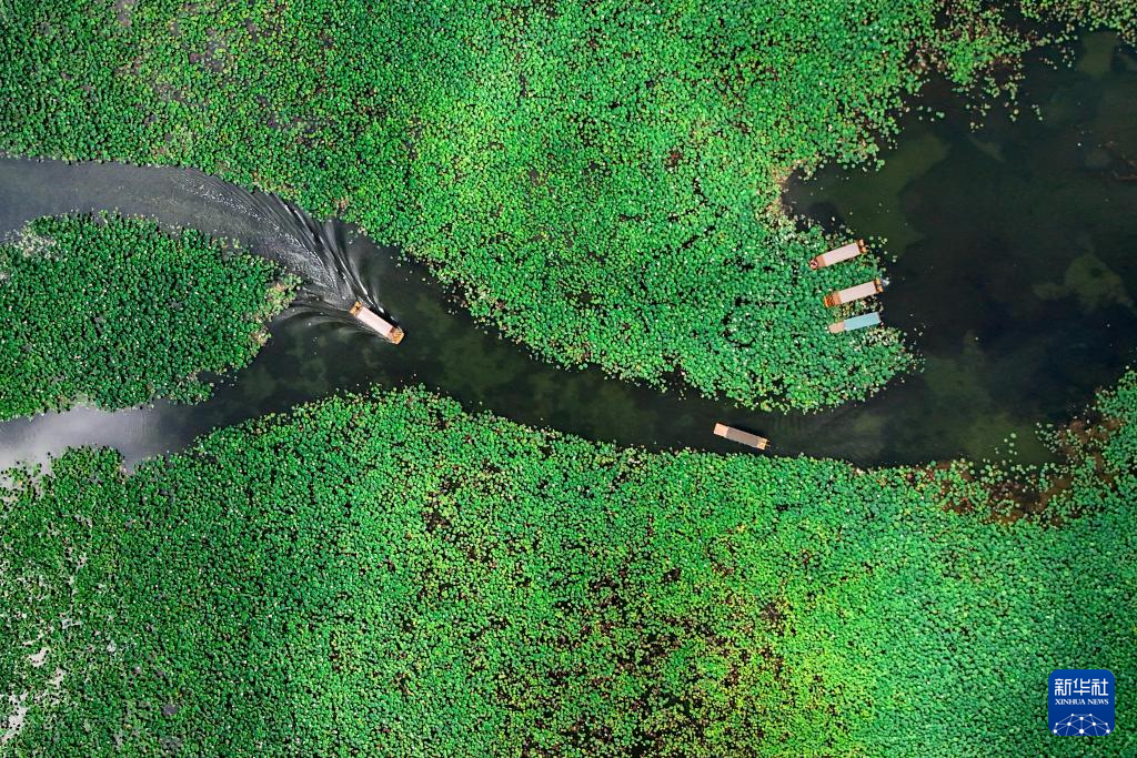 7月16日,游客在普者黑景区内乘船游览(无人机照片)。新华社发(彭奕凯摄)