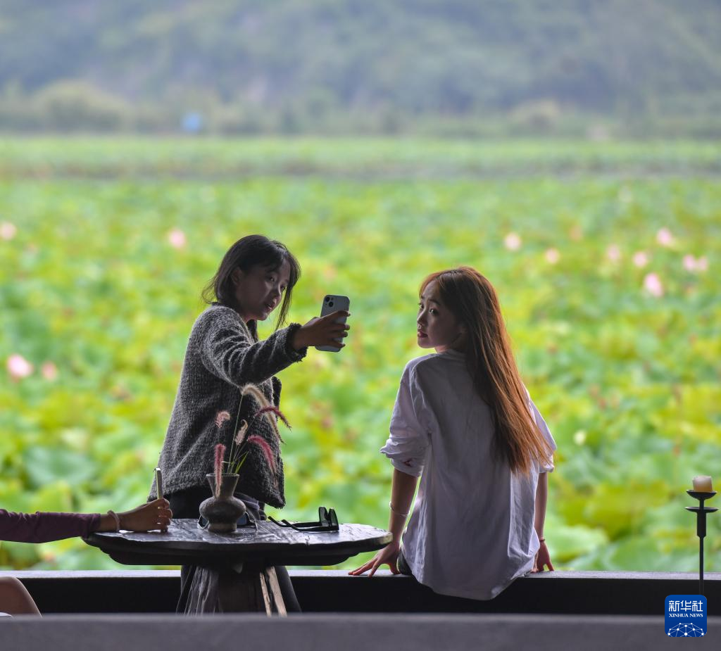 7月15日,游客在普者黑景区内的一家咖啡馆拍照打卡。新华社发(彭奕凯摄)