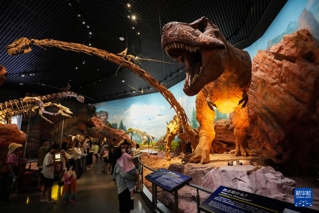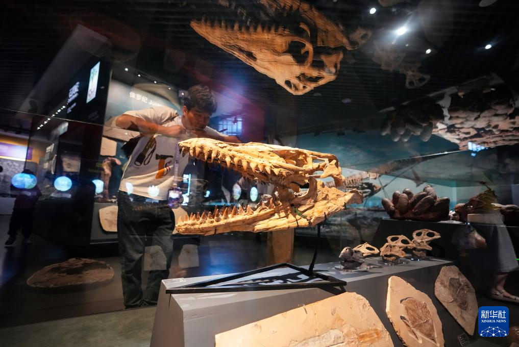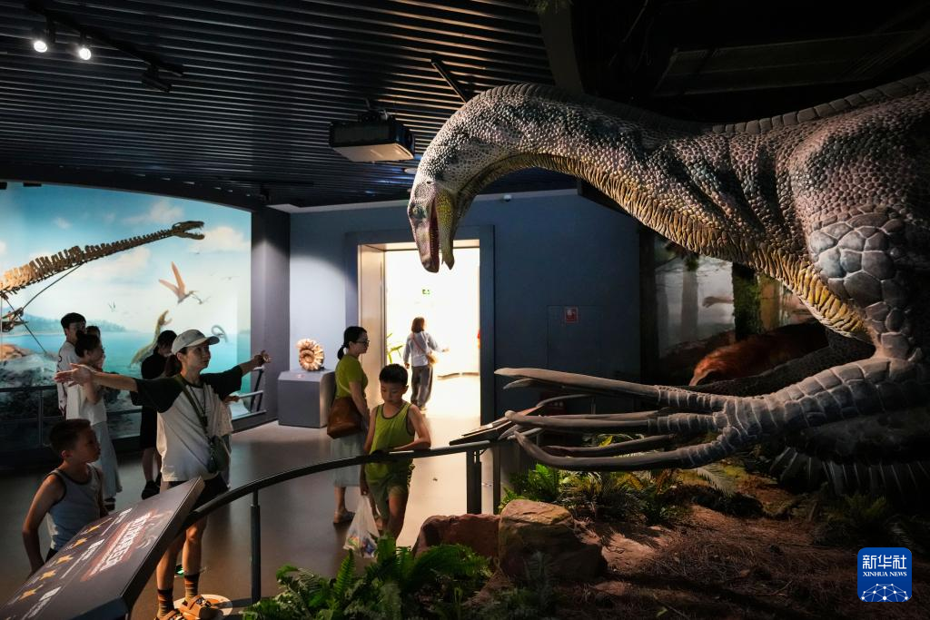 7月15日,游客在澄江化石地世界自然遗产博物馆参观恐龙模型及化石。新华社记者 陈欣波 摄